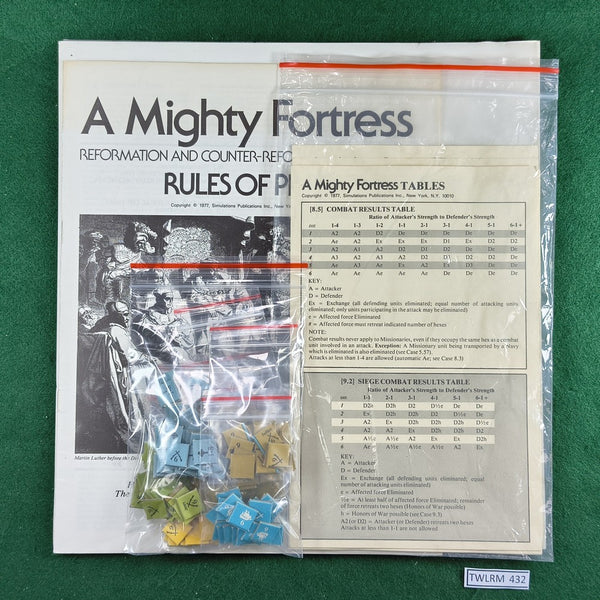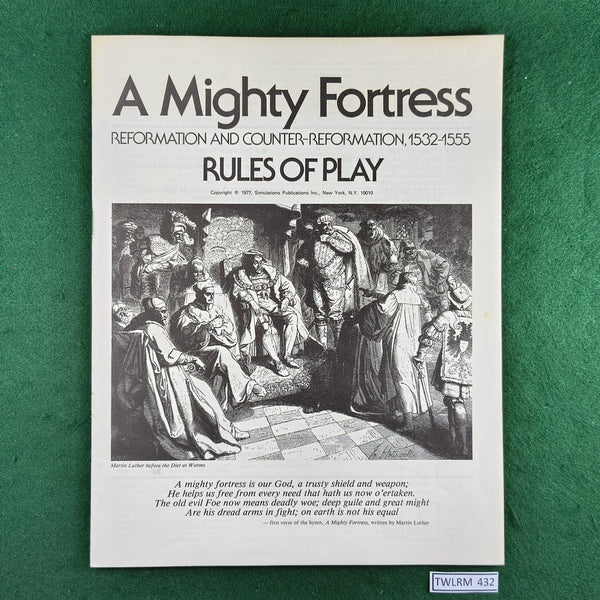 A Mighty Fortress covers the twenty-four years from 1532 to 1555 -- a period fraught with shifting alliances, political and religious fervor, and frantic efforts to shift the balance of power. Theological debates, treaties of peace, declarations of war, excommunication, taxation, and missionaries -- all are included in this simulation of one of the most violent and implacably hostile eras of European history. The game covers all actions from the year 1532 -- right after formation of the Schmalkaldic League -- until 1555 and the Peace of Augsburg, which guaranteed Lutheranism as a religion [sic] and allowed the German estates to choose between that and Catholicism.