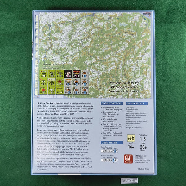 "A Time for Trumpets" (ATFT) is a battalion level wargame of the Battle of the Bulge. The game system incorporates a number of concepts from two of the highly playable games on the same subject: Bitter Woods by The Avalon Hill Game Company and the iconic battalion level Wacht am Rhein from SPI in 1977. In addition, the command and control concepts devised for the TAHGC version of The Siege of Jerusalem were utilized.