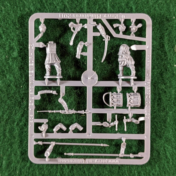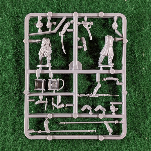 Two hard plastic Zouave infantry from Perry Miniatures. They are represented in full zouave kit, the most colourful uniforms seen on the battlefields of the American Civil War. The figures are all advancing rapidly and with this command sprue you can build an officer and a drummer or standard bearer. Also for all the zouaves both unadorned fezzes and fezzes with turbans (for those units who occasionally used them in the field) are included.