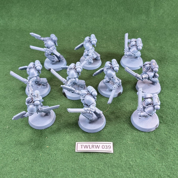 Unit of 10 Assault Intercessors in various poses. Armed with chainsword and heavy bolt pistol.