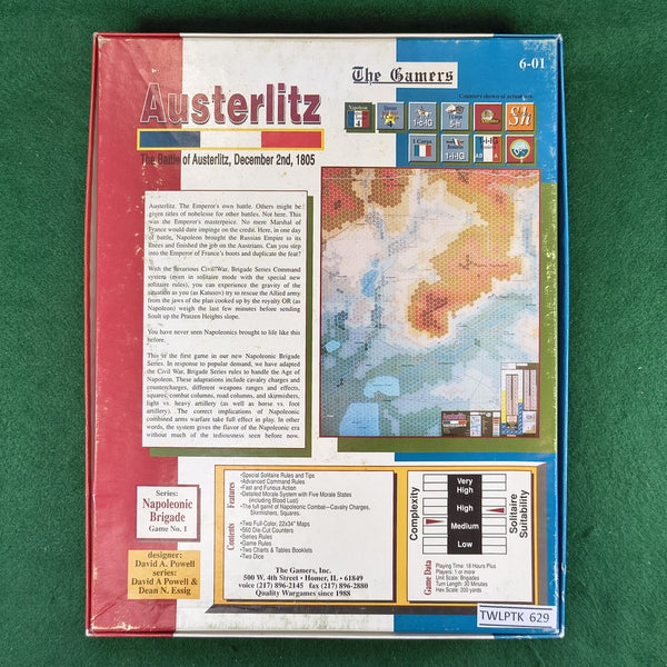 Austerlitz: The Battle of Austerlitz, December 2nd, 1805 is the first game in The Gamer's Napoleonic Brigade Series of Tactical level board-wargames. Game scale is 30 minutes per turn with each hex representing 200 yards. The game include some very generic notes for solitaire play.