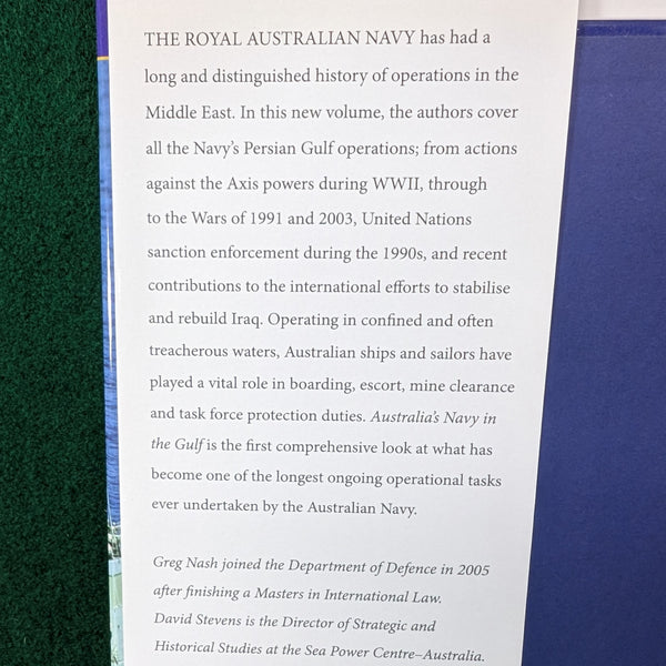 Australia’s Navy in the Gulf is the first comprehensive look at what has become one of the largest ongoing operational tasks ever undertaken by the Australian Navy.The authors are experts in their fields. Greg Nash joined the Department of Defence in 2005 after finishing a Masters in International Law. David Stevens is the Director of Strategic and Historical Studies at the Sea Power Centre-Australia.