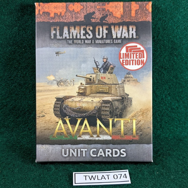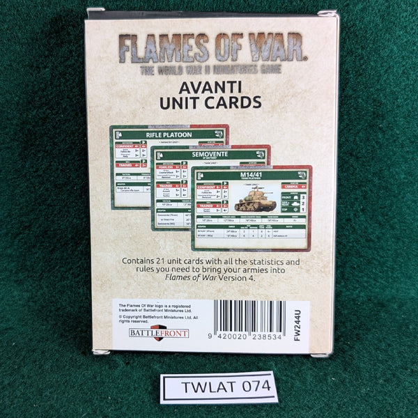 For a limited time only boxes of Unit Cards were available for each Flames Of War Mid War book. The packs contain one of each Unit Card that relates to their book. The packs have been designed to assist existing players that have already bought FoW miniatures and built their armies under previous editions and want cards to help transition to V4.
