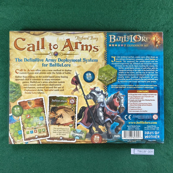 Call to Arms is the first purchasable expansion to the popular BattleLore game system. This expansion allows for the personalized deployment of your troops. Individual games will no longer be subject to predetermined scenarios and troop placement.