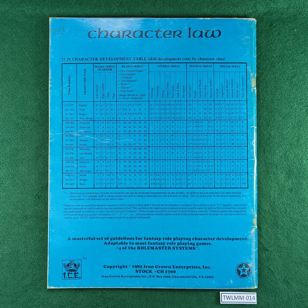 Character Law, 1st Edition is an original Rolemaster core rulebook which is essentially a player's manual without detailed information about magic or weapons while the book Campaign Law is essentially a gamemaster's guide. Topics include character creation, character classes, character races, character skills, and a price chart.