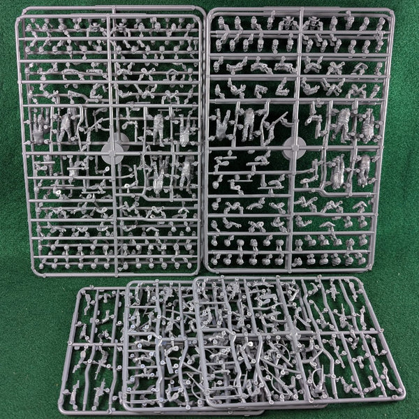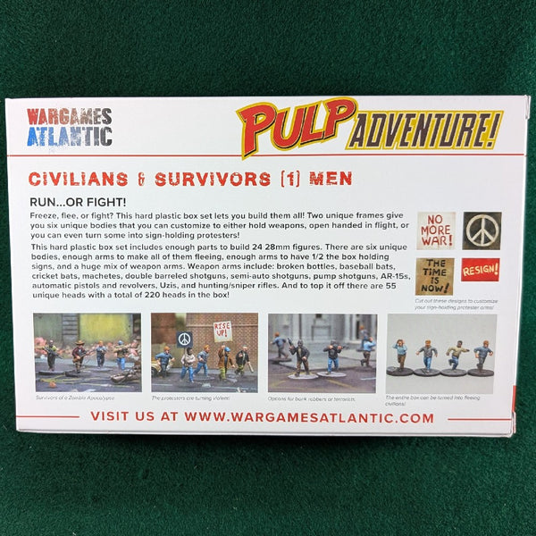 This hard plastic box set includes enough parts to build 24 28mm figures. There are six unique bodies, enough arms to make all of them fleeing, enough arms to have 1/2 the box holding signs, and a huge mix of weapon arms. Weapon arms include: broken bottles, baseball bats, cricket bats, machetes, double barreled shotguns, semi-auto shotguns, pump shotguns, AR-15s, automatic pistols and revolvers, Uzis, and hunting/sniper rifles. And to top it off there are 55 unique heads with a total of 220 heads in the box!