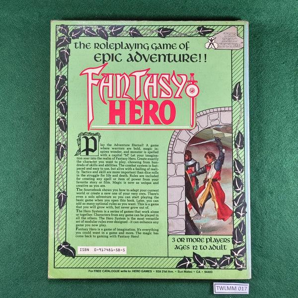 Play the Adventure Eternal! A game where warriors are bold, magic inspires wonder, and monster is spelled with a capital "M." Let your imagination soar into the realm of Fantasy Hero. Create exactly the character you want to play, choosing from hundreds of skills and abilities. The combat system is fast-paced and easy to use, but alive with a feeling of reality. Tactics and skill are more important than dice rolls in the struggle for life and death. Rules are included for creating any spell or item of power from your favorite story or film. Magic is now as unique and creative as you are.
