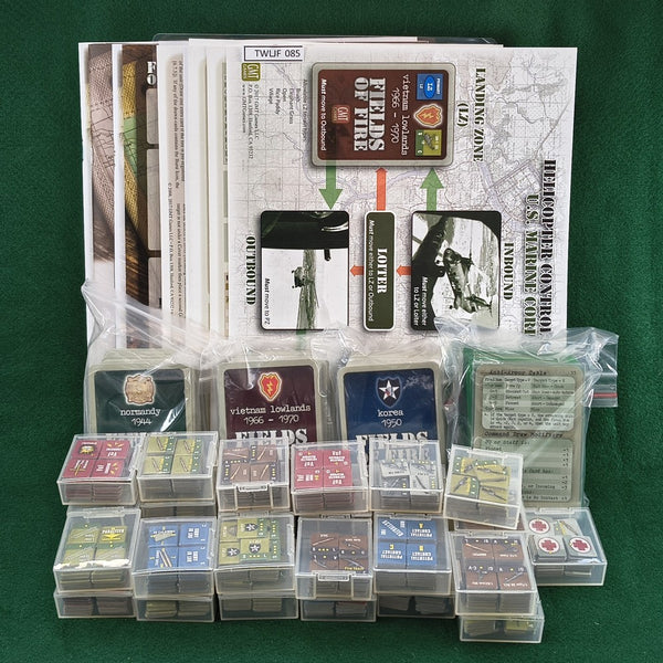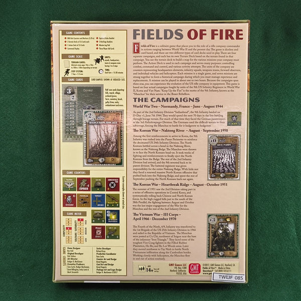 Fields of Fire is a solitaire game of commanding a rifle company between World War II and Present Day. The game is different from many tactical games in that it is diceless and card based. There are two decks used to play. The Terrain Deck is based on a specific region and is used to build a map for the various missions your company must perform. The Action deck serves many purposes in controlling combat, command and control, various activity attempts. The units of the company are counters representing headquarters elements, squads, weapons teams, forward observers, individual vehicles or helicopters. A single game is a mission and several missions from a historical campaign are strung together for the player to manage experience and replacements. A mission can be played in about 1 – 4 hours.