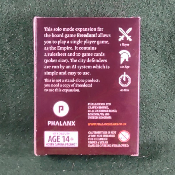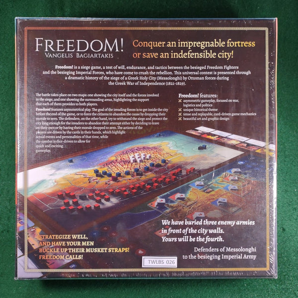 Freedom! is a siege game, a test of will, endurance and tactics between the besieged freedom fighters and the besieging imperial forces, who have come to crush the rebellion. This universal contest is presented through a dramatic history of the siege of a Greek Holy City (Messolonghi) by Ottoman forces during the Greek War of Independence.