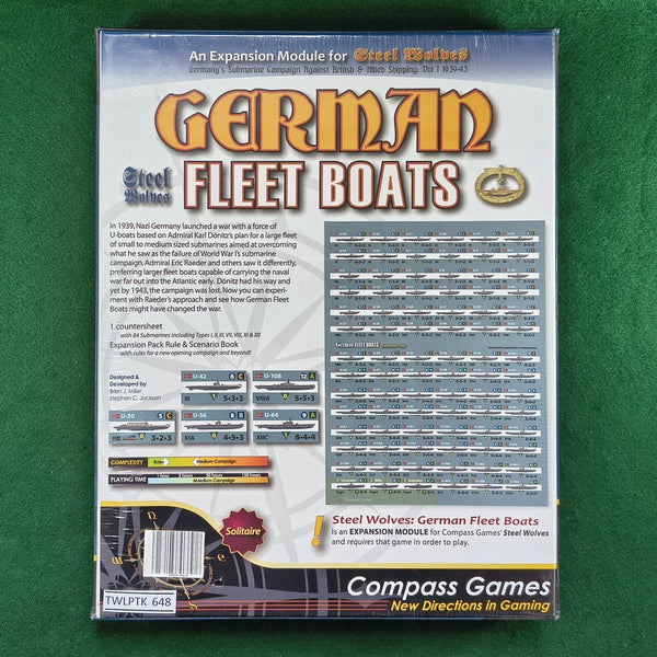 German Fleet Boats is an expansion game for Compass Game's Steel Wolves - the German Submarine Campaign against Allied Shipping 1939-1943. German Fleet Boats assumes that Germany never entered into the 1935 agreement, instead following OKM’s original view that aircraft and hydrophone technology will dramatically impact concentrated submarine operations around the British Isles and that the fleet boat concept of long range submarines are needed to operate outside areas of dense ASW coverage.
