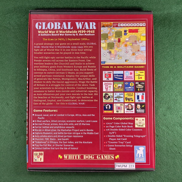A grand strategic solitaire war game, Global War: World War II Worldwide 1939-1945 lets you fight all of World War II in one three-hour sitting! Smaller scenarios can be played in less time.