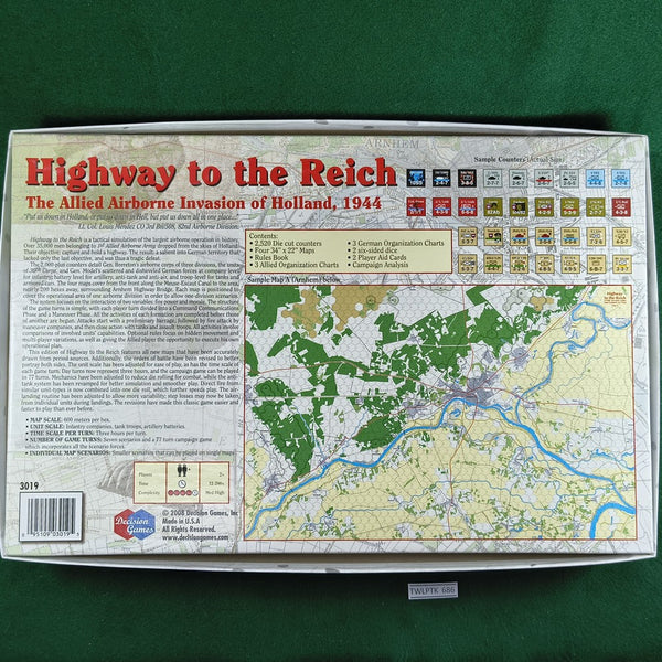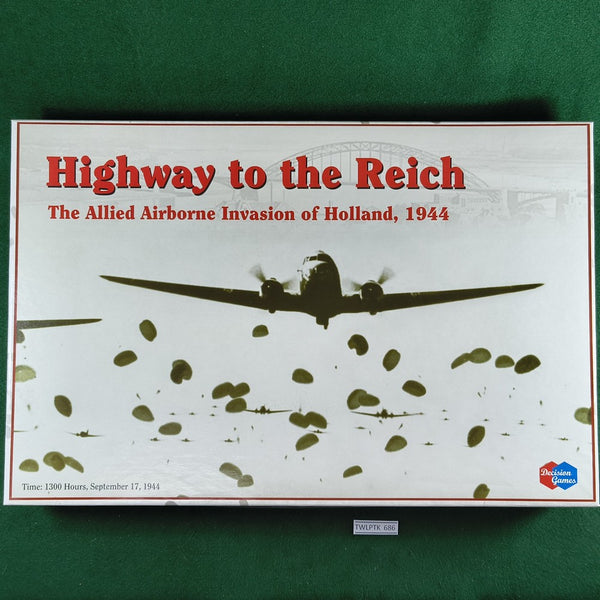 Highway to the Reich is a tactical simulation of the largest airborne operation in history. Over 35,000 men belonging to 1st Allied Airborne Army dropped from the skies of Holland. Their objective: capture and hold a highway. The result: a salient into German territory that lacked only the last objective, and was thus a tragic defeat.