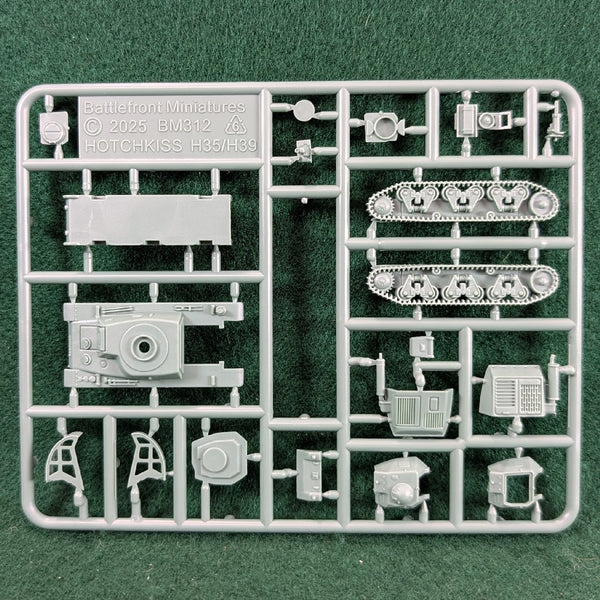 One French Hotchkiss H35/H39 tank for Flames of War. Hard plastic, assembly with plastic cement is required. Supplied unpainted.