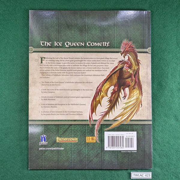 Ice Tomb of the Giant Queen is a Pathfinder Roleplaying Game adventure for 10th-level characters. The adventure continues the Giantslayer Adventure Path, a classic sword & sorcery campaign that pits the players against hordes of evil giants. Several new monsters, an overview of the most infamous graveknights to walk Golarion, an exploration of the giant organizations of the Inner Sea, and Clinton J. Boomer’s Pathfinder Journal round out this volume of the Pathfinder Adventure Path!