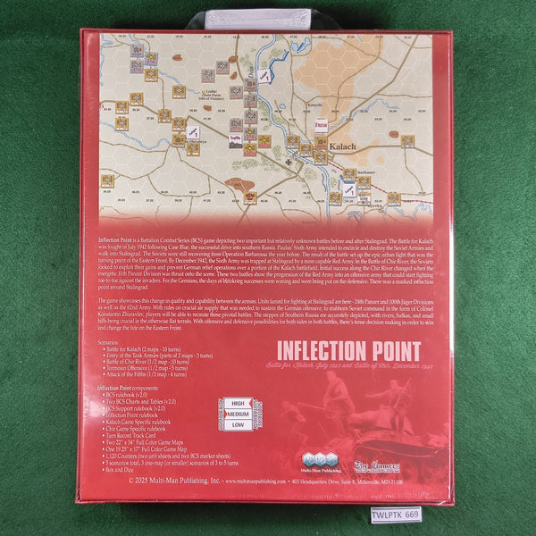 Inflection Point is a Battalion Combat Series (BCS) game depicting two important but relatively unknown battles before and after Stalingrad. The Battle for Kalach was fought in July 1942 following Case Blue, the successful drive into southern Russia. Paulus' Sixth Army intended to encircle and destroy the Soviet Armies and walk into Stalingrad. The Soviets were still recovering from Operation Barbarossa the year before. The result of the battle set up the epic urban fight that was the turning point of the Eastern Front. By December 1942, the Sixth Army was trapped at Stalingrad by a more capable Red Army. In the Battle of Chir River, the Soviets looked to exploit their gains and prevent German relief operations over a portion of the Kalach battlefield. Initial success along the Chir River changed when the energetic 11th Panzer Division was thrust onto the scene. These two battles show the progression of the Red Army into an offensive army that could start fighting toe-to-toe against the invaders. For the Germans, the days of blitzkrieg successes were waning and were being put on the defensive. There was a marked inflection point around Stalingrad.