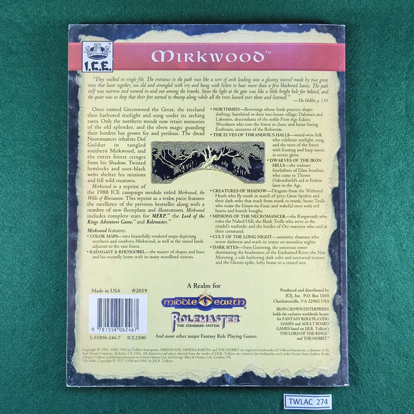 Mirkwood is a reprint of the 1988 ICE campaign module titled Mirkwood, the Wilds of Rhovanion. This reprint as a realm piece features the excellence of the previous bestseller along with a number of new floorplans and illustrations. Mirkwood includes complete stats for MERP™, the Lord of the Rings Adventure Game™ and Rolemaster™.