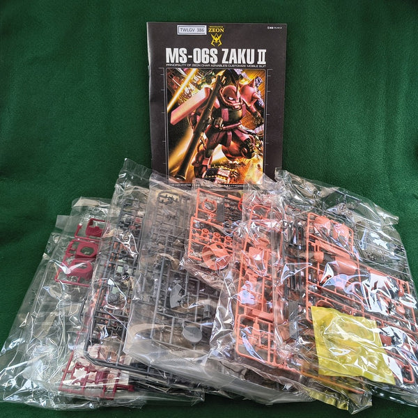 This kit features a completely revamped inner frame construction that allows for an even greater range of articulation and realistic movement; it's even able to be posed kneeling on one leg as seen in the show! Aside from the improved articulation, one of the major features of this kit is the incredible new moulding process that has two different sections of the pipes moulded together for easy slide assembly. Weapons include a Zaku machine gun, a Zaku bazooka, and a heat hawk. Two types of blade antennas are included along with a lift vehicle to bring the included 1/100-scale standing Char Aznable (moulded in red) to the cockpit.