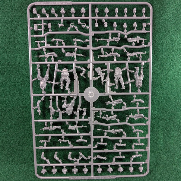 This hard plastic sprue includes enough parts to build 5 28mm figures. There are five unique bodies and a mix of modern weaponry including knives, pistols, AR and M-model rifles, AK model rifles, G-model rifles, sniper rifles, light machine-guns/squad automatic rifles, and more! To top it off there are 27 unique heads.