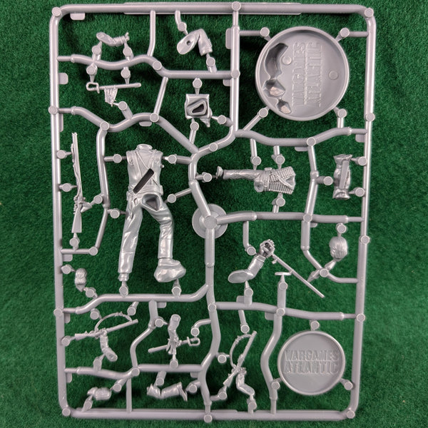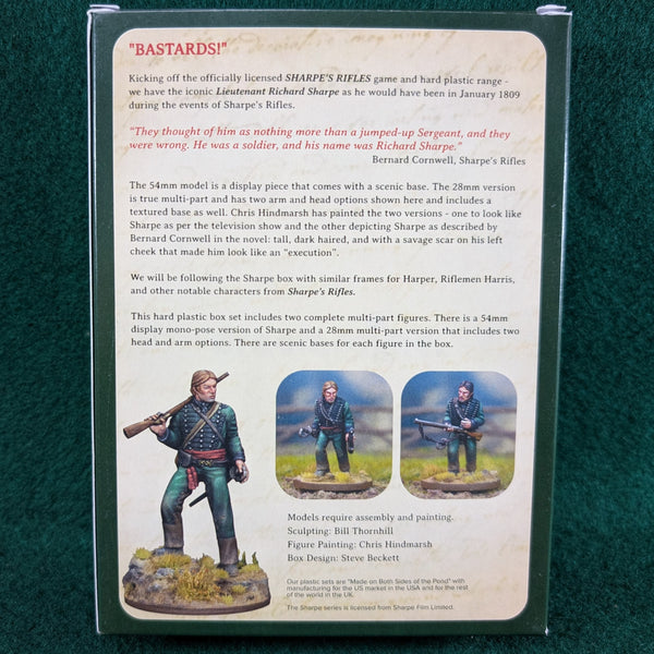 This hard plastic box set includes two complete multi-part figures. There is a 54mm display mono-pose version of Sharpe and a 28mm multi-part version that includes two head and arm options. There are scenic bases for each figure in the box.