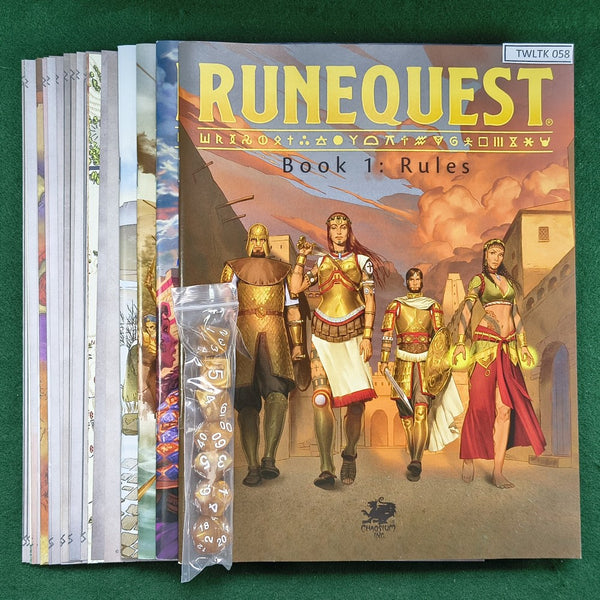 The RuneQuest Starter Set contains books, dice, maps, and enough content to keep a group engaged and entertained for several roleplaying sessions. The box also includes 12 pregenerated character folios, giving each player a wide range of playstyles and backgrounds to choose from.
