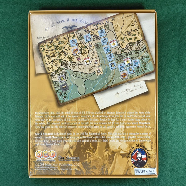 South Mountain is the fourth game in the Civil War, Regimental Series. With one map and a manageable number of counters, it is the first game in the series to offer a full, intense, battle that is playable in an evening. And re-playability is very high, given the variable arrival of some key Rebel forces and the application of Confederate and Union Random Events.