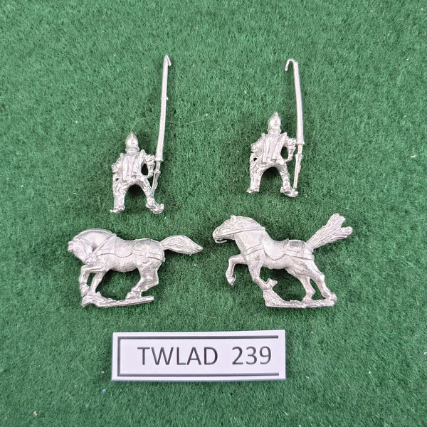 Pack of 2 miniatures (2 horses, 2 riders), depicting 16th century Spanish lancers in 3/4 armour, with open faced helmet.