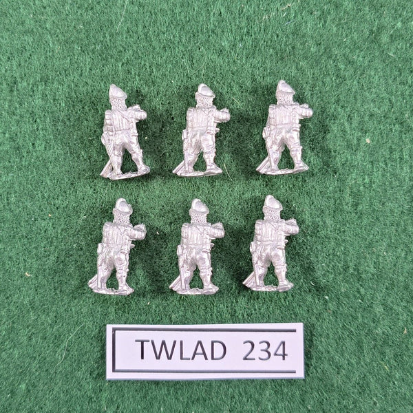 Pack of 6 15mm miniatures, either Spanish or English Musketeers of the 16th century with morion, loading arquebus.