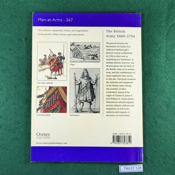 The period between the Restoration of Charles II in 1660 and Marlborough's decisive victory at Blenheim in 1704 is often seen as something of a 'backwater' in military history; however, this 40-year pause saw the birth of the British Army in its modern form, and the establishment of many regiments that survive to this day. This book examines the uniforms and equipment of the British Army during this eventful, if often overlooked, period of the reign of Charles II, James II and William II. Colour plates, illustrations and photographs portray infantry uniforms and equipment, as well as the uniforms and weapons of the horse, in vivid detail.