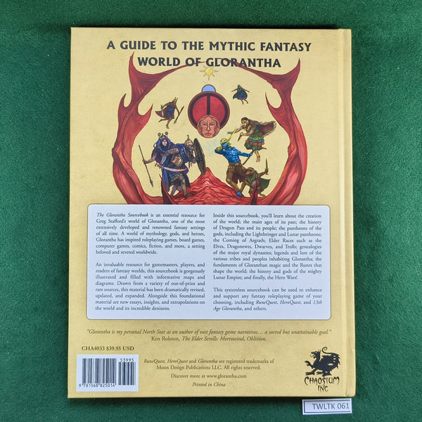The Glorantha Sourcebook is an essential resource for Greg Stafford’s world of Glorantha, one of the most extensively developed and renowned fantasy settings of all time. A world of mythology, gods, and heroes, Glorantha has inspired roleplaying games, board games, computer games, comics, fiction, and more, a setting beloved and revered worldwide.