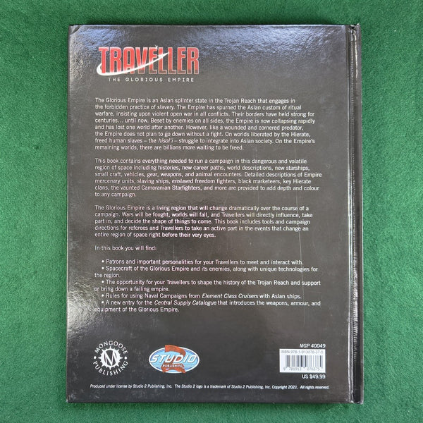 The Glorious Empire is a living region that will change dramatically over the course of a campaign. Wars will be fought, worlds will fall, and Travellers will directly influence, take part in, and decide the shape of things to come. This book includes tools and campaign directions for referees and Travellers to take an active part in the events that change an entire region of space right before their very eyes.