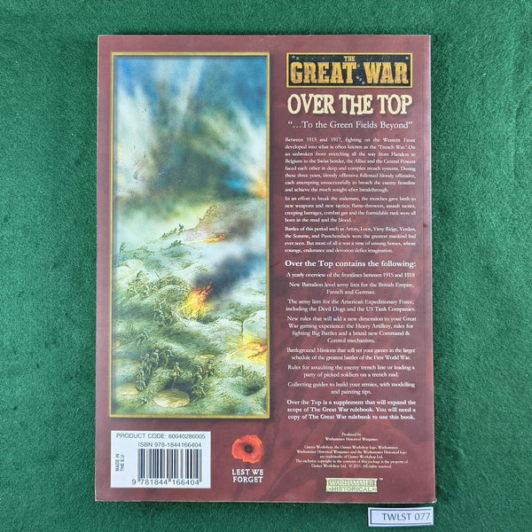 Over the Top contains a full year-by-year overview of the 1915-18 period, new Battalion-level army lists for British Empire, French and German forces, and a new army list for the American Expeditionary Force, including the Devil Dogs and US Tank Companies. It also contains detailed rules covering such actions as assaulting a trench line, or leading a hand-picked party on a trench raid, as well as background missions to set miniature wargames within the larger backdrop of some of the greatest actions of the First World War.