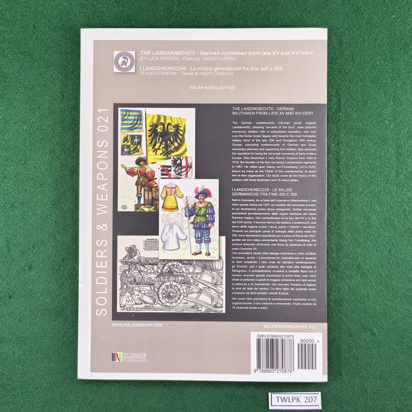 The German Landsknechte (German plural, singular Landsknecht), meaning "servants of the land", were colourful mercenary soldiers with a redoubtable reputation, who took over the Swiss forces' legacy and became the most formidable military force of the late 15th and throughout 16th century Europe, consisting predominantly of German and Swiss mercenary pikemen and supporting foot soldiers, they achieved the reputation for being the universal mercenary of early modern Europe. Was Maximilian I, Holy Roman Emperor from 1493 to 1519, the founder of the first mercenary Landsknecht regiments in 1487. He called upon Georg von Frundsberg (1473-1528), known by many as the Father of the Landsknechte, to assist him in their organization. Our book, cover all the history of this soldiers with finest illustration all in colour and 16 artistic colour plates.