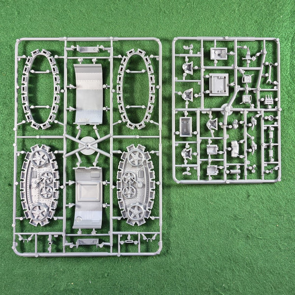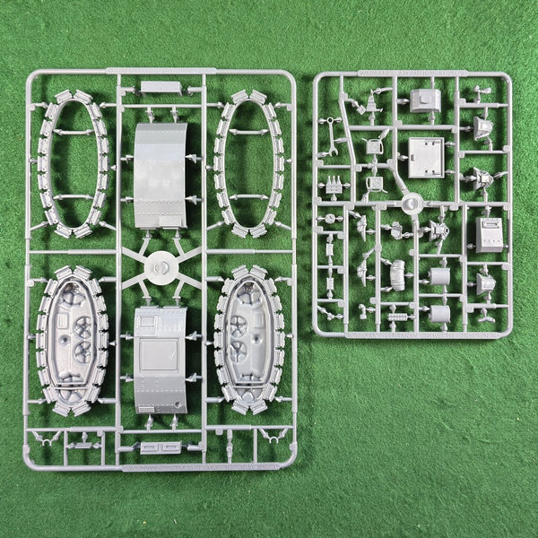 This hard plastic box set includes two frames with all the parts to build one Chyweethl tractor and crew.