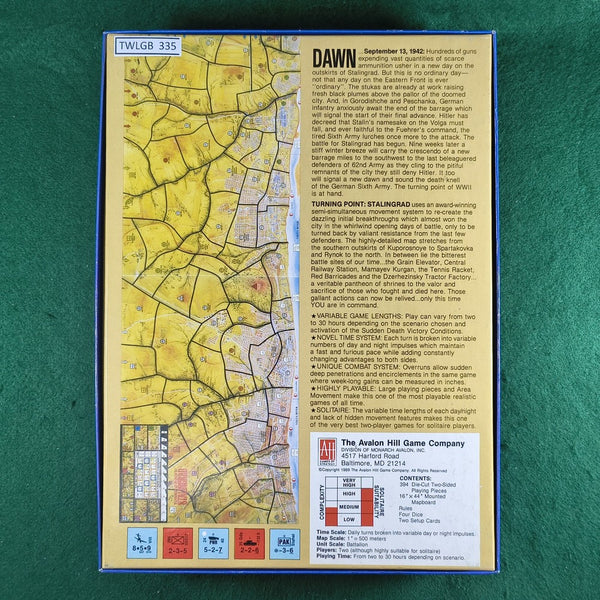 Turning Point: Stalingrad is mid-complexity wargame on the battle of Stalingrad during World War 2. Attackers from the German 6th Army must dislodge the Russian 62nd Army and take the city of Stalingrad before the commencement of Operation Uranus. If the city could be taken, German troops could then be re-deployed to reinforce the Italian and Rumanian formations holding the flanks of along the Volga. The fiasco at Stalingrad can then be prevented.